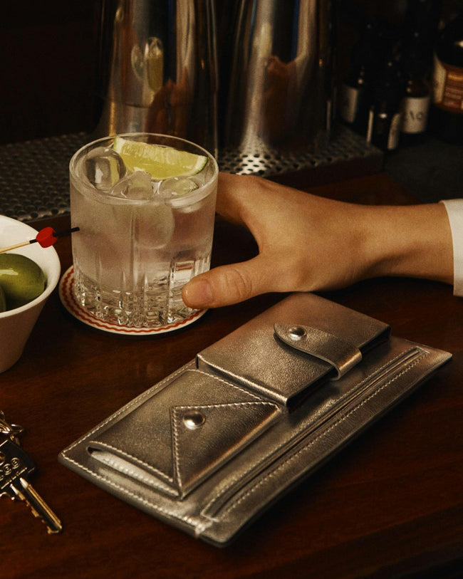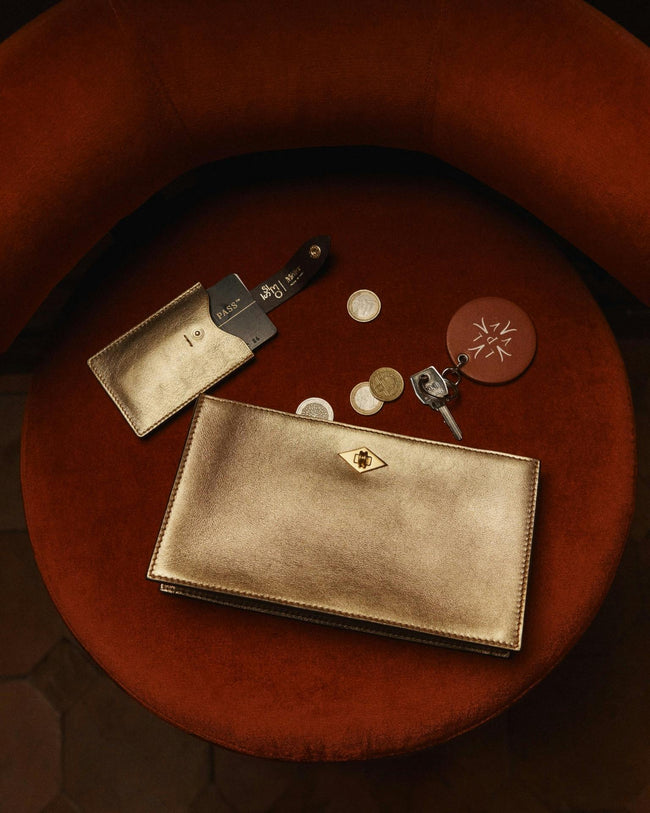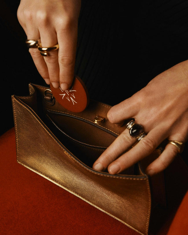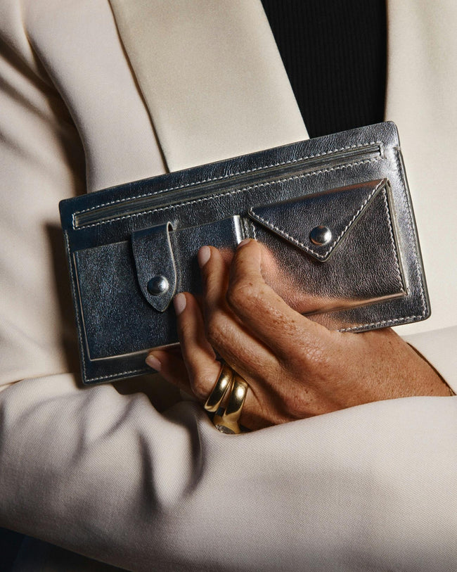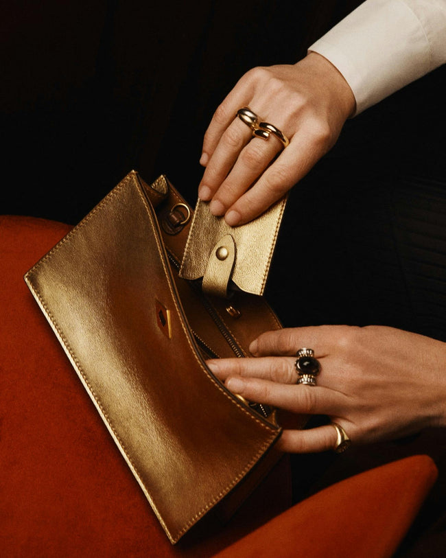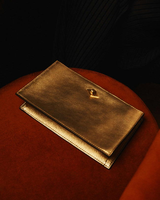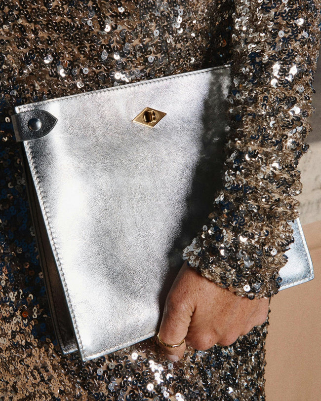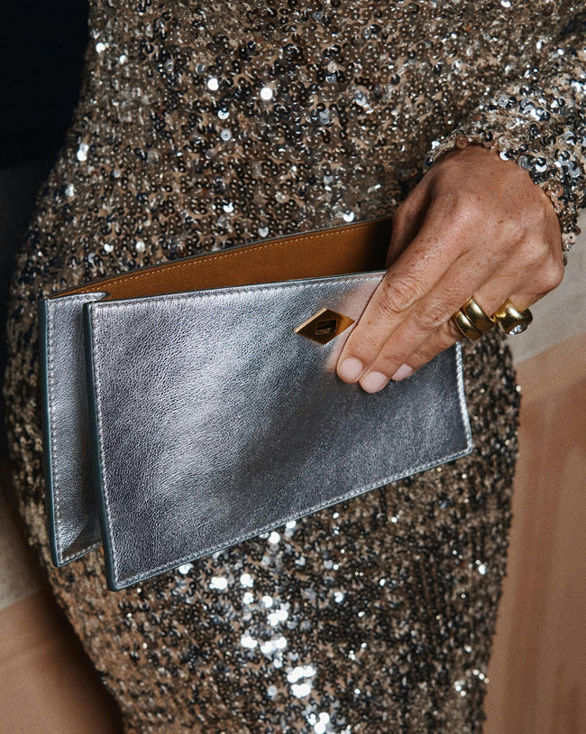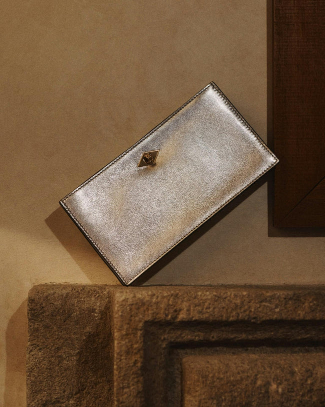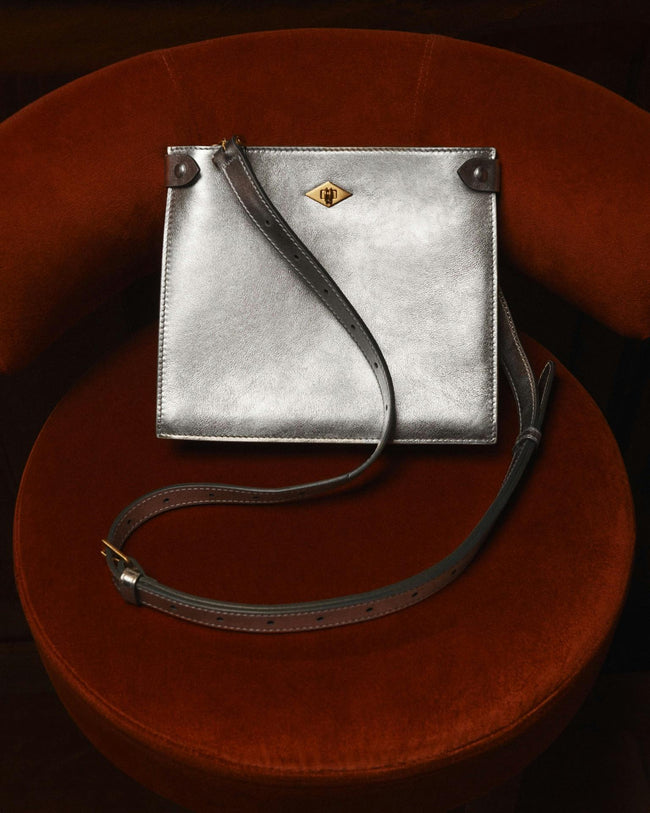 Presented in collaboration with ISSIMO - an extension of the Hotel Pellicano world and the exquisitely curated purveyor of all things chic and Italian - this exclusive capsule was inspired by a reverence for glamorous summer nights from the heyday of Italian disco. Featuring shimmering metallic tones, handcrafted calfskin handbags and small leather goods glitter in gold and silver hues.