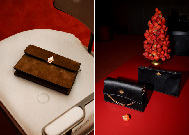 Sculptural floral installations and strawberry towers by florist Carolina Malabet sat alongside our evening bags dotted on tables and the seductive qualities of the suede, satin, and lustrous leather were reflected in the classic party food. Caviar blinis, fresh oysters on the shell and fresh cream-filled eclairs were served to guests, who between bites danced to a playlist curated by DJ Isabella Massenet.