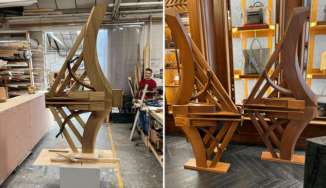 To retain, and show off, its beautiful, natural characteristics, it was decided the wood would be left lightly buffed and treated with just a slight wax to finish. Perched in our storefront window, the completed piece appears as an elegant, abstracted, skeletal sculpture, hinting at its inspiration from nautical origins as well as providing a compelling display in celebration of Frieze.