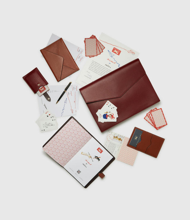 Meticulously conceived and crafted to help with all of your organisational needs, the multi-tasking, Italian leather range includes a slimline, pocketed passport wallet; a versatile envelope joined by blank notecards; a lightweight folio fit for documents and tablets; a notebook cover and a notebook complete with both dotted and lined pages (not to mention a handful of Air Mail surprises); and a playing card case, which houses a deck of cards featuring illustrations by the inimitable Italian artist and Air Mail contributor Andrea Ferolla. Designed to go the distance, each piece is the perfect companion on journeys both short and long.