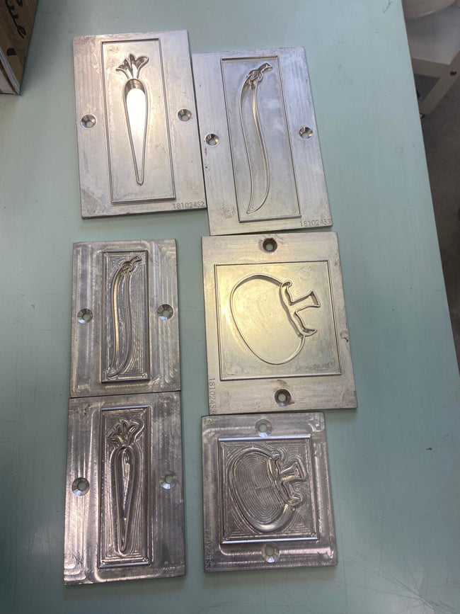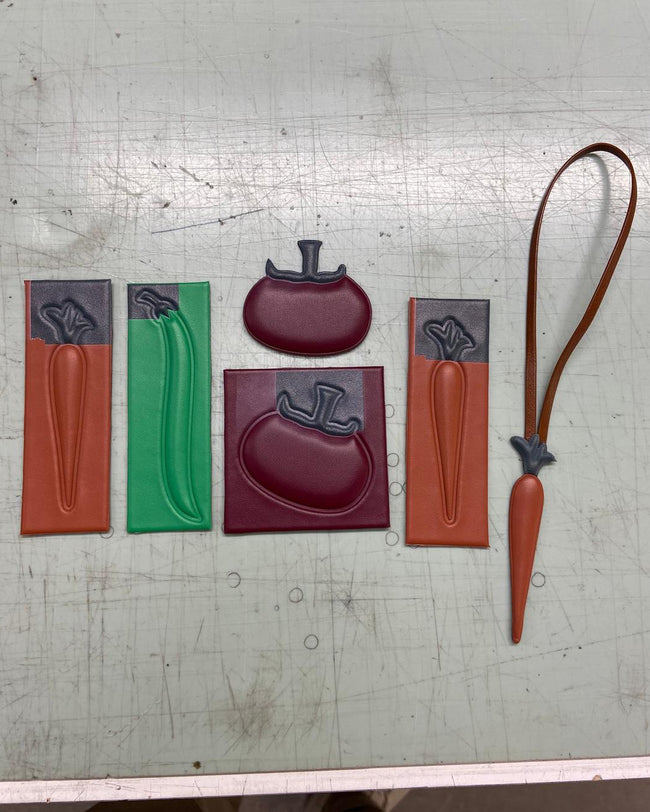 To make each charm, pieces of leather are cut and embossed to the form. Special padding called bombé is placed between the pieces of leather to add dimension to the shape.
