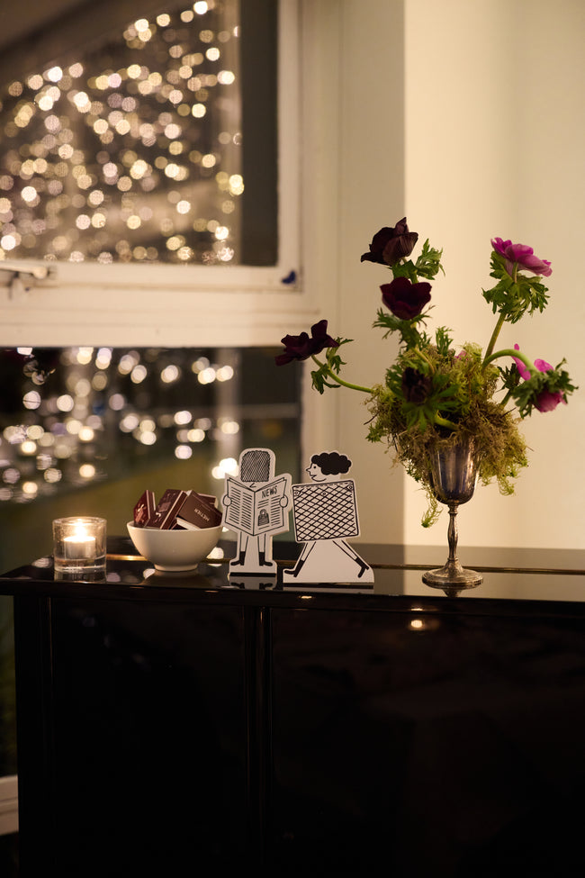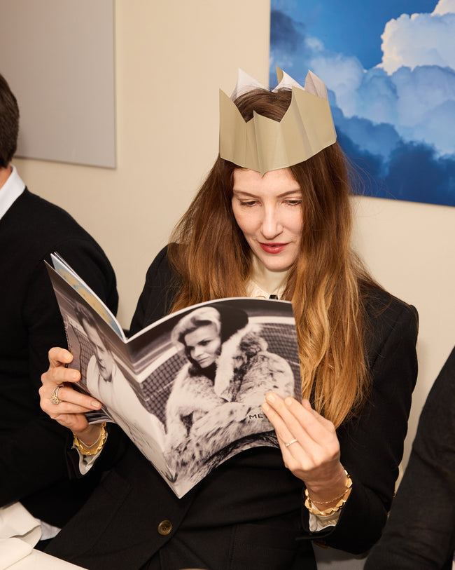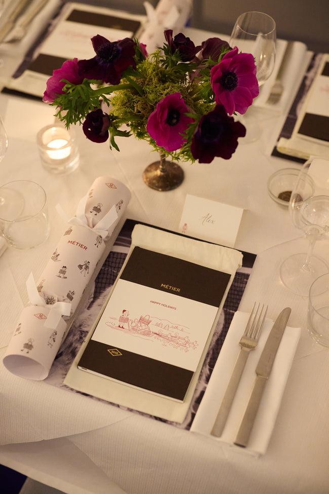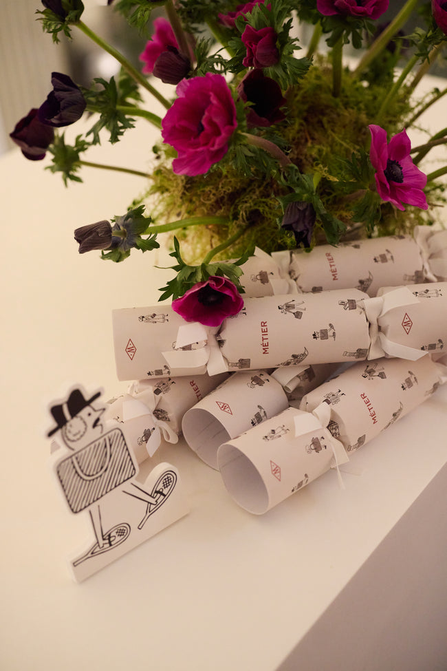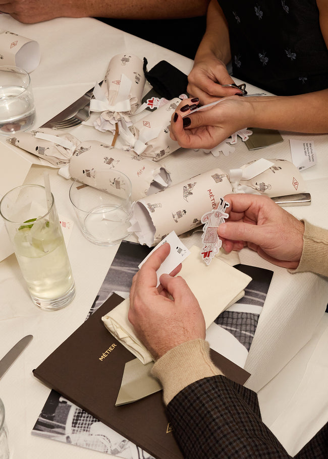 Of course no Christmas table is complete sans a set of crackers to snap, surprise and delight. Inside our custom crackers - wrapped with a wintry scene of our holiday characters - guests discovered miniature decks of cards, pocket-sized puzzles, petite pairs of dice, chuckle-inducing jokes, Métier stickers, and, but of course, silver crowns.