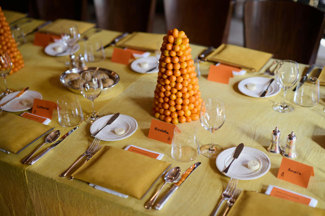 Following the tour, guests gathered in the Library for lunch where they were greeted by an artfully-inspired tablescape featuring the afternoon’s tablecloths naturally dyed with yellow onion skins to capture the brilliant shade of the museum’s iconic stained glass windows. Created by English artist Stephanie Callaghan through a process called mordanting where she sourced, cut to size, washed and hand-dyed linens sustainable made in Europe.