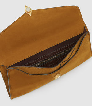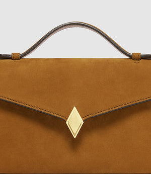 A structured clutch for day-into-evening, featuring clean lines and soft curves. Métier’s signature diamond motif appears in distinctive details, including a diamond-shaped clasp and top handles.